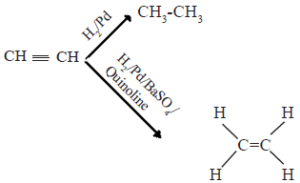 • In the presence of catalysts such as finely powdered Pt, Pd or Ni alkynes react with hydrogen to give alkanes. The reaction can be stopped at the intermediate alkene stage by using a Pd/BaSO4 catalyst poisoned by quinoline.