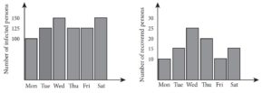 For questions 21 and 22, refer the following graphs which show the number of infected and recovered persons in each day from some non-fatal viral fever in a selected region during six consecutive days.