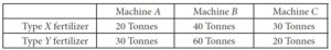 There are three machines in a factory which make fertilizer upon orders. Each machine is capable of making any type of fertilizer, but no machine must be used to produce two or more types during one day. Capacity of each machine i.e. the amount of each type of fertilizer X, Y that each machine can produce in one hour is given below in Tonnes.