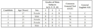 The table gives a summary of information on five candidates who have applied for employment in a company.