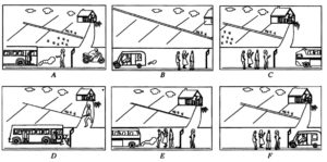 Six pictures depicting the incident described below are drawn below: