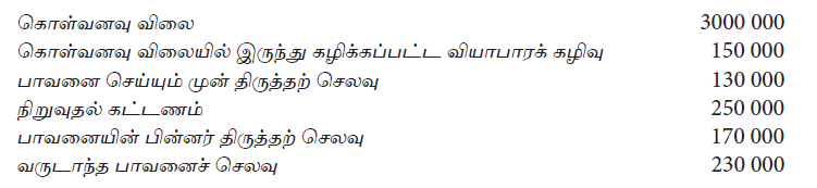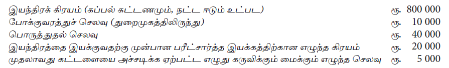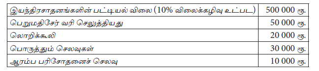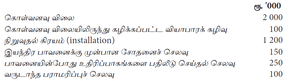 கொள்வனவின் போது 10% வியாபாரக் கழிவு பெறப்பட்டது. ஆரம்ப பரிசோதனையின்போது உற்பத்திசெய்யப்பட்ட 100 அலகுகள் அலகொன்று ரூ. 300 ஆக விற்பனை செய்யப்பட்டது. LKAS 16 (ஆதனம், பொறி மற்றும் உபகரணம்) இன்படி ஆரம்ப இனங்காணலில் இயந்திரத்தின் கிரயம் :