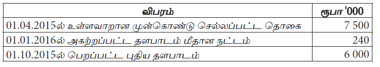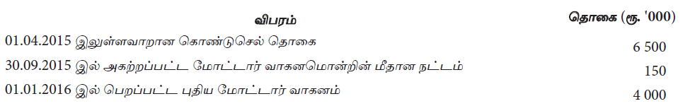 31.03.2016 இல் முடிவடைந்த வருடத்திற்கான மோட்டார் வாகனங்களுக்கான பெறுமானத் தேய்வும் மற்றும் அகற்றப்பட்ட மோட்டார் வாகனத்தின் விற்பனையிலிருந்து பெற்ற தொகையும் பின்வருவனவற்றுள் எவை?
