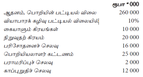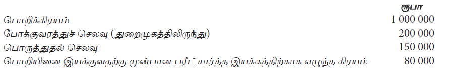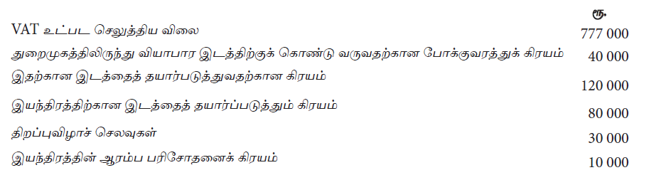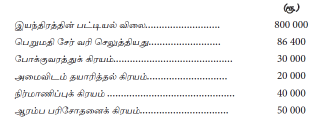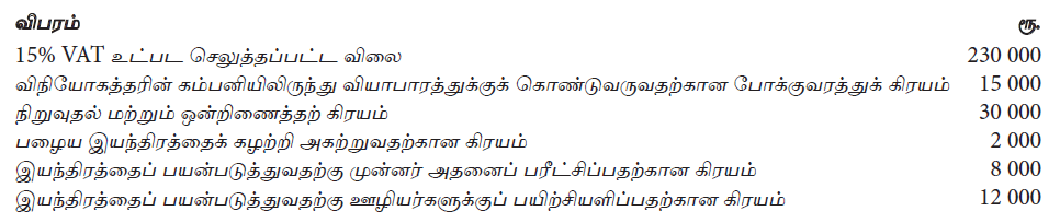 நிறுவனமொன்றினால் பெற்றுக் கொள்ளப்பட்ட இயந்திரம் தொடர்பாக ஏற்பட்ட சில கிரயங்கள் கீழே தரப்பட்டுள்ளன.