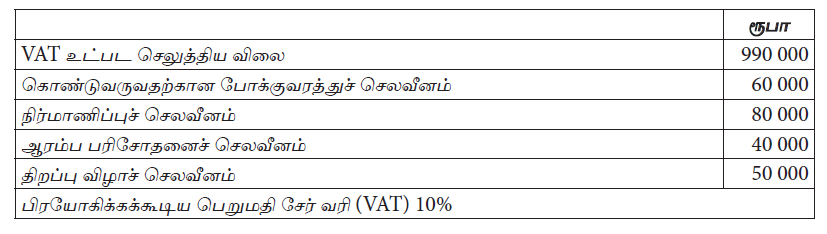 பெறுமதி சேர் வரி (VAT) பதிவினைக் கொண்டுள்ள வரையறுத்த அஜீத் பொதுக் கம்பனியானது 01.04.2015 இல் இயந்திரமொன்றை ரூ. 4 140 000 இற்கு வாங்கியது. இத்தொகையில் ஏயுவு இற்காகச் செலுத்திய ரூ. 540 000 உம் உள்ளடக்கியுள்ளது. இந்த இயந்திரத்தின் பயன்தரு ஆயுட்காலம் 5 வருடங்களாகும். இதற்கு எஞ்சிய பெறுமதி எதுவும் இல்லை.