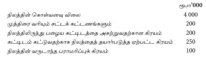 கம்பனியொன்று உணவுச்சாலையொன்றைக் கட்டுவதற்காக 01.10.2012 இல் நிலமொன்றை வாங்கியது. இது தொடர்பில் பின்வரும் செலவுகள் ஏற்பட்டுள்ளன.