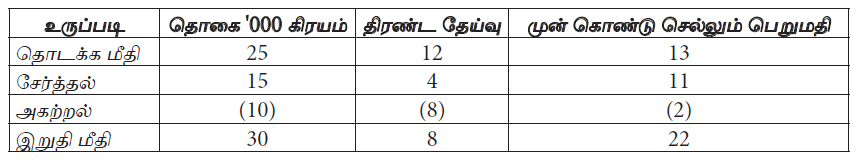 2010.03.31 இல் நிறுவனம் ரூ. 42 000 கிரயமுடையதும் ரூ. 28 000 திரண்ட பெறுமானத் தேய்வையும் கொண்ட இயந்திரமொன்றை இது போன்ற இன்னோர் இயந்திரமொன்றுக்காக அதே தினத்தில் பரிமாற்றம் செய்தது. பழைய இயந்திரத்தின் பரிமாற்ற விலை இதன் முன் கொண்டுவரும் தொகை என ஏற்றுக்கொள்ளப்பட்டது. புதிய இயந்திரத்தின் விலை ரூ. 44 000 ஆகும். இதன் வேறுபாடு காசாகச் செலுத்தப்பட்டது. இப்பரிமாற்றம் காரணமாக இந்நிறுவனத்தின் இயந்திரத்தின் முன்கொண்டுவரும் தொகையில் ஏற்பட்ட தேறிய அதிகரிப்பு என்ன?