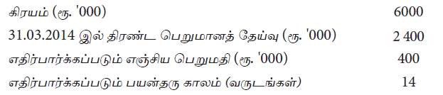 இயந்திரத்தின் இயலளவை பாரியளவில் மேம்படுத்துவதற்கு கம்பனியானது 01.04.2014 இல் ரூ. 1 800 000 செலவு செய்துள்ளது. இதன் காரணமாக எஞ்சியுள்ள பயன்தரு காலமானது 10 வருடத்திற்கு அதிகரித்துள்ளது. எனினும், அதன் எஞ்சிய பெறுமதி மாறாது காணப்பட்டது.