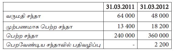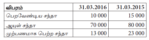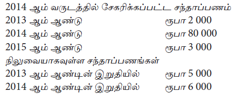 31.12.2014 வருமதி சந்தாவும் 01.01.2014 இல் முற்பண சந்தாவும் முறையே ரூ. 40 000 மும் ரூ. 50 000 மும் ஆகும். 2013 ம் ஆண்டில் வருமதியாயிருந்த சந்தா ரூ. 15 000 31 டிசம்பர் 2014 வரை பெறப்படவில்லை.