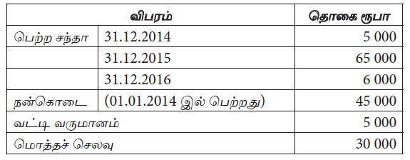 2014 ம் ஆண்டில் காசாக பெறப்பட்ட சந்தா பணம் ரூ. 225 000 ஆகும். 2014ம் ஆண்டிற்கான சந்தா வருமானமாக அமைவது