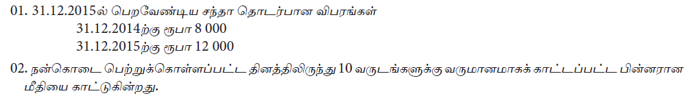 மேற்பட்ட தகவல்களை மாத்திரம் கருத்தில் கொண்டால் 2015.03.31 இல் நிதிநிலைமைக்கூற்றில் பொறுப்பாகவும் சொத்தாகவும் இனங்காணப்பட்ட பெறுமதி