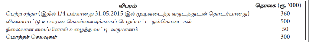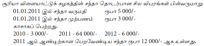 விளையாட்டுக் கழகம் ஒன்றின் 31.03.2016 முடிவுற்ற ஆண்டுக்கான சந்தாவுடன் தொடர்பான தகவல்கள் வருமாறு :