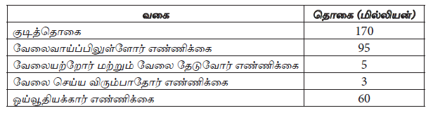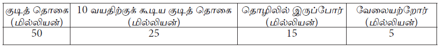 நாடொன்றின் சில குடித்தொகைத் தரவுகள் கீழே தரப்பட்டுள்ளன. (தரவுகள் மில்லியனில்)