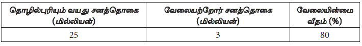 கற்பனைப் பொருளாதாரமொன்றின் வேலைவாய்ப்பு மற்றும் வேலையின்மை பற்றிய தரவுகள் பின்வரும் அட்டவணையிற் காட்டப்பட்டுள்ளன.