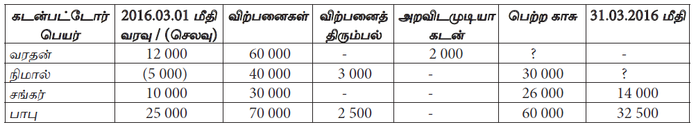 2016.03.31 ஆம் திகதி நிதிக்கூற்றில் காட்டவேண்டிய கடன்பட்டோர் மீதி எவ்வளவு?