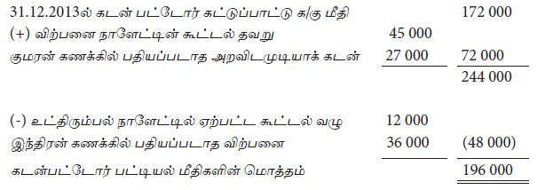 2014.03.31 இல் கடன்கொடுத்தோர் கட்டுப்பாட்டுப்பாட்டுக் கணக்கு மீதி ரூபா 189 000 ஐ காட்டியது. அதே தினத்தில் தனித்தனி கடன்கொடுத்தோர் கணக்குகளின் மீதிகளின் கூட்டுத்தொகை ரூபா 198 000 மாக காணப்பட்டது. இது ஒருவழுவின் காரணமாக ஏற்பட்டது எனில் அவ்வழு