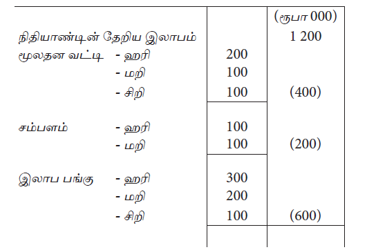 ஹரி, மறி, சிறி என்பவர்களால் நடாத்திச் செல்லப்பட்ட பங்குடமை வணிகத்தின் 2016.03.31 இல் முடிவடையும் வருடத்திற்கு தயாரித்த இலாபப் பகிர்வு கூற்று பின்வருமாறு