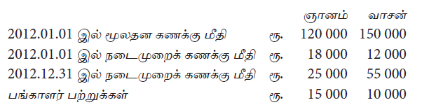ஞானம், வாசன் இலாப நட்டத்தை 2 : 1 விகிதத்தில் பங்கு கொள்ளும் பங்காளிகளாவார்கள் 2012 டிசம்பர் 31 இல் அவர்களின் நிலையான மூலதனம் மீது வருடாந்தம் 10% மூலதனவட்டி நடைமுறைக்கணக்கில் செலவு வைத்துள்ளனர். வாசனுக்கான வருடாந்த சம்பளம் ரூபா 33 000 நடைமுறைக் கணக்கில் செலவு வைக்கப்பட்டு இருந்தது. மூலதன மீதியும் நடைமுறை மீதியும் முறையே வருமாறு