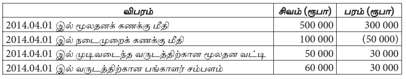 சாமியும், பூமியும் 01.04.2014 இல் முறையே ரூபா 150 000 , 200 000 மூலதனம் இட்டு பங்குடைமை ஒன்றினை ஆரம்பித்தனர். இலாப நட்ட விகிதம் சமன். இலாபப் பகிர்வும் எடுப்பனவுகளையும் மூலதனக் கணக்கின் ஊடாக பதிவு செய்யத் தீர்மானித்தனர்.