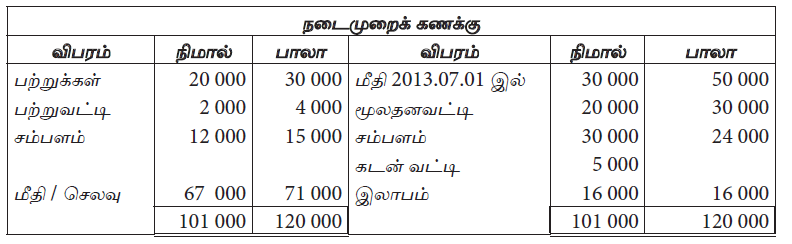நிமால், பாலா இலாப நட்டங்களை சமமாக பகிரும் பங்காளர்களாவர். இப்பங்குடமையில் 2014.06.30 இல் முடிவடைந்த நிதி வருடத்தில் தயாரிக்கப்பட்ட அவர்களின் இலாப பகிர்வின் பின்னர் நடைமுறைக் கணக்கு பின்வருமாறு காணப்பட்டது.