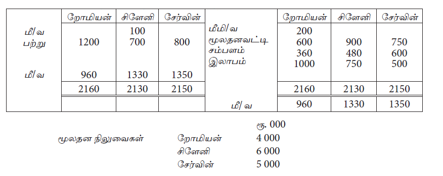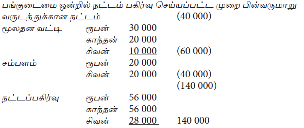 சிவம், பரம் ஆகிய இருவரும் இலாபநட்டங்களை முறையே 4 : 3 என்ற அடிப்படையில் பகிரும் பங்காளர்கள். இப்பங்குடமையிலிருந்து எடுக்கப்பட்ட தகவல்களை வருமாறு