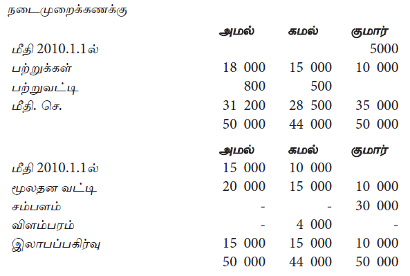 அமல்இ கமல்இ குமார் ஆகியோரின் பங்குடமை வியாபாரத்தின் 2010.12.31 இல் நடைமுறைக் கணக்கு பின்வருமாறு தயாரிக்கப்பட்டது.
