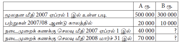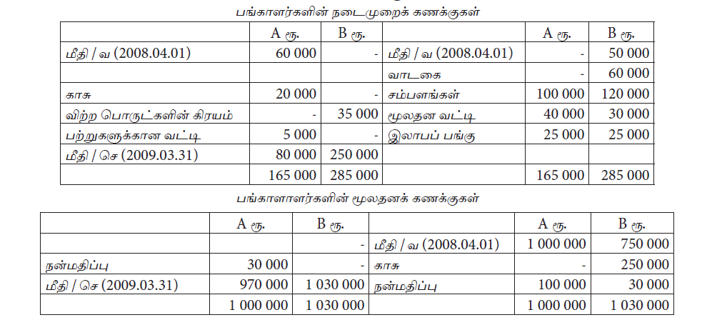 A, B ஆகிய இருவரும் எழுத்து மூல உடன்படிக்கையொன்றை ஏற்படுத்தாது பங்குடமை வியாபாரமொன்றை நடத்தி வருகின்றனர். பின்வரும் தகவல்கள் கணக்குப் புத்தகங்களிலிருந்து பிரித்தெடுக்கப்பட்டன.