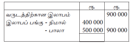 நிமாலும் பாலாவும் இலாப நட்டங்களைச் சமனாகப் பகிரும் பங்காளர்களாவர். நிமால் பாலாவுக்கு பங்குடைமை வியாபாரத்திலிருந்து ஆகக் குறைந்த வருடாந்த வருமானத்திற்கு உறுதி வழங்கினார். மேலே கூறப்பட்ட உடன்பாட்டிற்கமைய நிமால், பாலாவுக்கிடையிலான வருடத்திற்கான இலாபப் பகிர்வு கீழே தரப்பட்டுள்ளது.
