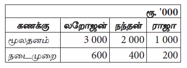 லறோஜன், நந்தன், ராஜா ஆகியோர் இலாப நட்டங்களை சமமாகப் பகிரும் வியாபாரமொன்றின் பங்காளர்கள். 01.04.2014 இலுள்ளபடியான பங்குடைமையின் மூலதனம் மற்றும் நடைமுறைக் கணக்கு மீதிகள் பின்வருமாறு இருந்தன.