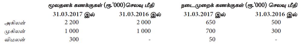 அகிலன், முகிலன் ஆகியோர் இவ்வருடத்தில் மேலதிக மூலதனம் எதனையும் இடவில்லை. 31.03.2017 இல் முடிவடைந்த வருடத்துக்கான பங்காளர் பற்றுக்கள் : அகிலன் ரூ. 210 000, முகிலன் ரூ. 200 000, விமலன் ரூ. 70 000. இவை நடைமுறைக் கணக்கினூடாகச் சீராக்கம் செய்யப்பட்டுள்ளன.