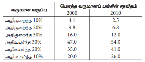 பின்வரும் அட்டவணையானது 2000 மற்றும் 2010 ஆம் ஆண்டுகளில் பொருளாதாரமொன்றின் மொத்தவருமானம் பல்வேறு வருமானக் குழுக்கள் மத்தியில் பங்கிடப்பட்ட விதத்தைக் காட்டுகிறது.