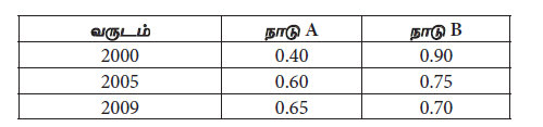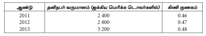 A மற்றும் B ஆகிய நாடுகளில் மூன்று வருட காலப் பகுதியில் கினி குணகம் மாற்றமடைந்துள்ள விதம் அட்டவணையிற் காட்டப்பட்டுள்ளது.