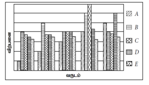 26, 27 ஆகிய வினாக்கள் ஐந்து வருட காலத்தினுள் முறையே, ஒவ்வொரு வருடத்தினதும் A, B, C, D, E ஆகிய ஐந்து கம்பனிகளின் விற்பனை அளவுகளைக் காட்டும் பின்வரும் வரைபினை அடிப்படையாகக் கொண்டவை.