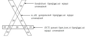 பாடசாலையொன்றில் க.பொ.த. (உயர் தர) தொழினுட்பவியல் பாடத்துறையைப் பயிலும் மாணவர் எண்ணிக்கையும் தகவல் தொடர்பாடல் தொழினுட்பம் (ICT) பாடத்தைப் பயிலும் மாணவரினது எண்ணிக்கையும் கீழே உருவில் காட்டப்பட்டுள்ளது.