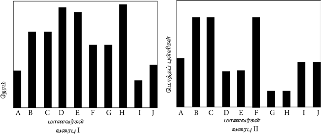 வரைபுகள் I,II ஆகியன பத்து மாணவர்கள் டியூசன் வகுப்புகளில் செலவிட்ட நேரத்தையும் க.பொ.த. (உ.த.)ப் பரீட்சையில் அவர்கள் பெற்ற மொத்தப் புள்ளிகளையும் முறையே குறிப்பிடுகின்றன.